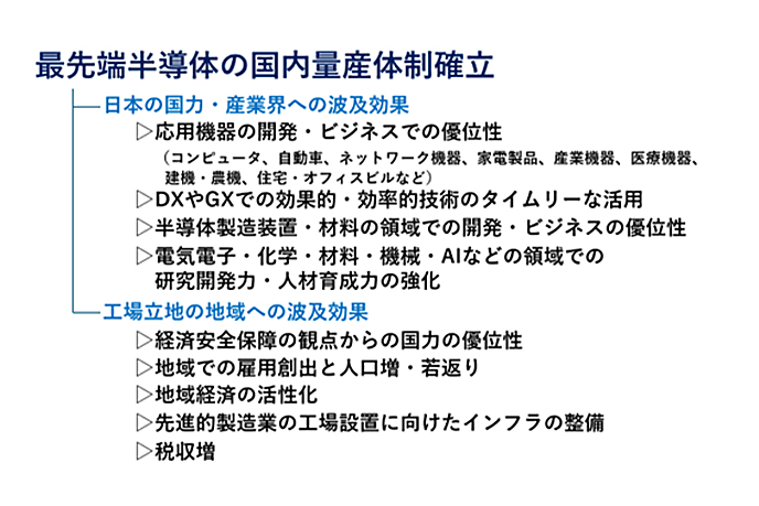 半導体産業においては、半導体ウエハー上に微細な素子を形成できる技術を保有することが、性能・コストの面で高い競争力を持つことを意味する。こうした最先端半導体を自国で開発・量産できることは、下流にある応用産業に与える波及効果が極めて大きい。コンピュータはもとより、自動車やネットワーク機器、家電製品、産業機器、医療機器、建機・農機、住宅・オフィスビルまで、あらゆる機器・システムの機能・性能が、搭載する半導体の質次第で決まる時代が到来している。これら工業製品を開発する産業の国際競争力を底上げするには、半導体メーカーとの密な連携と潤沢かつ安定的な供給体制の確保が欠かせない。