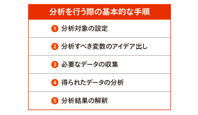 どんな対象を分析する際も、基本的には図の五つのステップを踏まえて進めていく。
