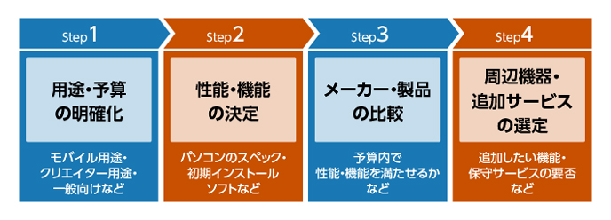 初めに、購入するパソコンの用途や予算を明確にします。用途の例としては、よく持ち歩くモバイル用途、高性能なスペックが必要なクリエイター用途などが挙げられます。