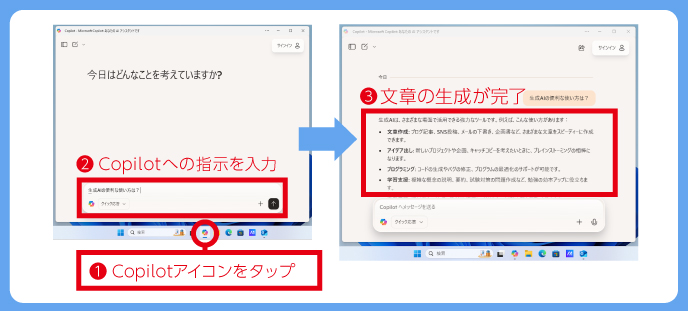 Copilotは、画面のサイドバーから起動できる対話型の支援ツールです。情報検索や設定変更、アプリの操作補助などを自然な言葉で指示でき、日常業務を効率化できます。