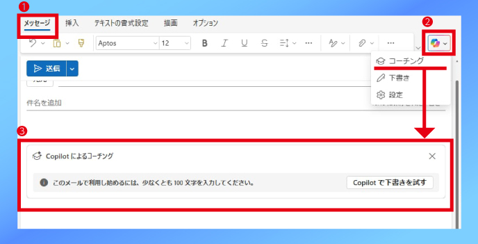 例えばOutlookでは、Copilotにより、メールの下書きを自動的に作成することが可能です。新規作成画面で「メッセージ」を押し、「Copilotマーク」→「コーチング」の順でタップすると、指示の入力を促すメッセージが表示されます。この状態で本文に指示を書き入れれば、内容やトーンに応じたメール文案が生成されるため、メールを一から書く手間が省けます。