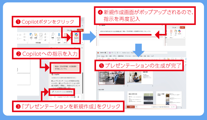 PowerPointに搭載されたCopilotを活用すれば、簡単な指示を入力するだけで、プレゼンテーションの構成や内容を自動で提案し、資料を作成してくれます。