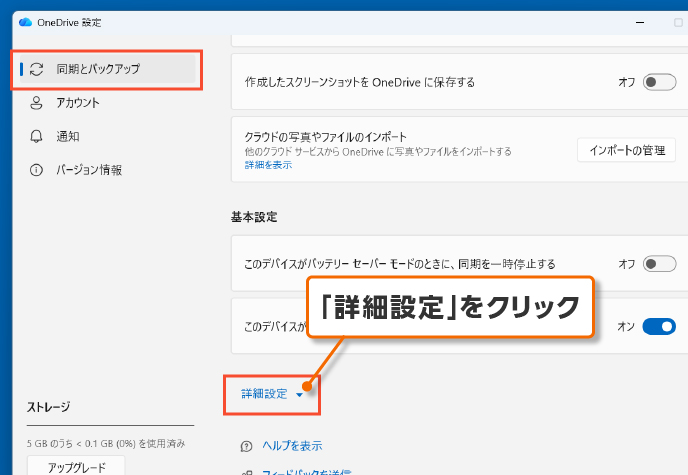 オフラインで利用したい場合は、画面右下の通知領域からOneDriveを開き、「設定」→「同期とバックアップ」→「詳細設定」→「すべてのファイルをダウンロードする」を有効化します。逆に容量が不足してきた場合は、「ディスク領域の解放(データをクラウド側に退避させる機能)」をオンにすることで、クラウド保存への自動切り替えが行われます。