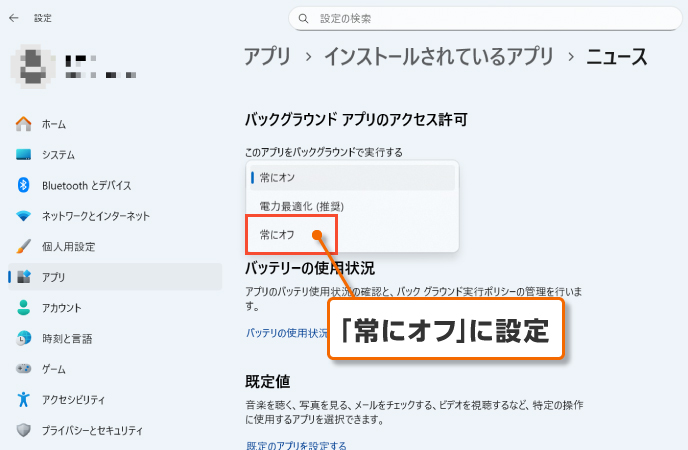 特に初期セットアップ直後は注意が必要です。Windows 11では、Microsoft Storeアプリのバックグラウンド実行が既定で有効になっています。普段使わないアプリはオフに切り替えることで、PC全体の動作が軽くなります。