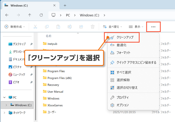 不要なファイルをまとめて削除したい場合は、「ディスク クリーンアップ」機能を活用するのが便利です。不要データを一括で整理でき、空き容量の確保や動作改善に役立ちます。設定手順は「タスクバーの『エクスプローラー』>PC>特定のドライブ>クリーンアップ」です。