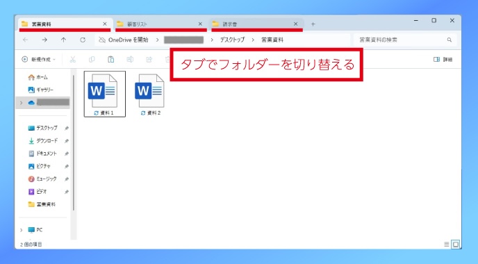 タブ表示は、例えば「営業資料」「請求書」「顧客リスト」といった異なるフォルダーを同時に確認したい場合や、ファイルを別のフォルダーにコピー・移動するときなどに便利です。ワンクリックでタブを切り替えれば、目的のフォルダーにすぐにアクセスできるため、作業が中断されにくくなります。