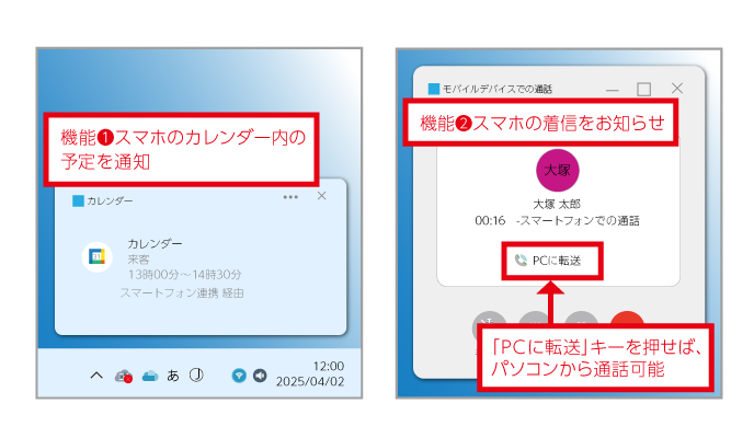 例えば、外出先で受けた連絡に対してオフィスのパソコンから即座に返信したり、スマホの着信にパソコンから応答したりといった使い方が可能です。業務中にスマホとパソコンを行き来せずに済むため、集中力を維持したまま効率よく作業を進められます。
