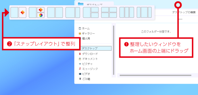 スナップレイアウトを使えば、開いているウィンドウを自動的に整列させることができます。ウィンドウの上部をドラッグすると、画面上に配置パターンが表示されるので、使いたいレイアウトを選ぶだけでOK。ウィンドウを画面の左右や四隅、中央などにすっきりと並べることができます。