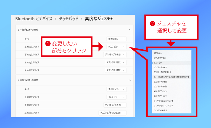 - ※ この機能を使用するには、PCに「高精度タッチパッド(Precision Touchpad)」が搭載されている必要があります。Windows 10からアップグレードした一部のPCでは、ハードウェアの仕様により一部機能が利用できない場合があります。