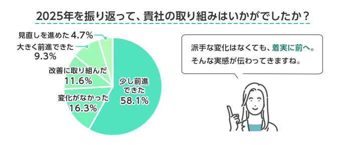 「少し前進できた」という回答が最も多く、全体の半数以上を占めています。大きな変化を起こしたというよりも、これまでの取り組みを続けながら、着実に前へ進もうとする企業が多かったことが分かります。また、「変化がなかった」とする回答も見られ、「改善に取り組んだ」「大きく前進できた」「見直しを進めた」といった回答はそれぞれ少数派となりました。