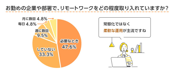 アンケート結果から、多くの企業ではリモートワークを「必要に応じて活用する」段階にとどまっていることが分かります。これは、リモートワークを全面的に推進するというよりも、業務効率や状況に応じて柔軟に取り入れる姿勢が一般的であることを示しています。