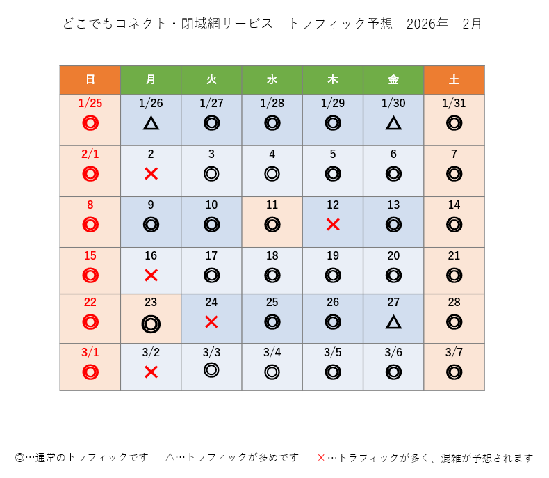 2026年2月度のファイアウォールサービス トラフィック予想を、ご案内いたします。トラフィックが多い予想の日は、ネットワーク混雑による速度の低下が起きやすくなります。