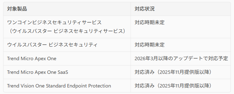 ※ Trend Micro Apex One SaaS およびTrend Vision One Standard Endpoint Protection は、2025年11月提供のビルド(14.0.20372)以降をご利用の場合、影響はございません。