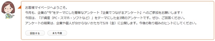 お客様マイページでは、毎月テーマを変えて企業の皆さまにアンケートを実施しています。