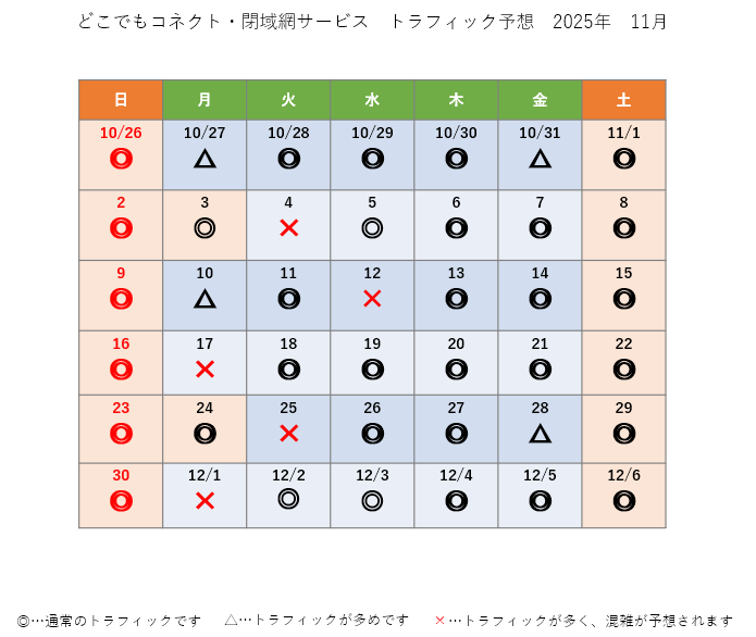 2025年11月度のファイアウォールサービス トラフィック予想を、ご案内いたします。トラフィックが多い予想の日は、ネットワーク混雑による速度の低下が起きやすくなります。